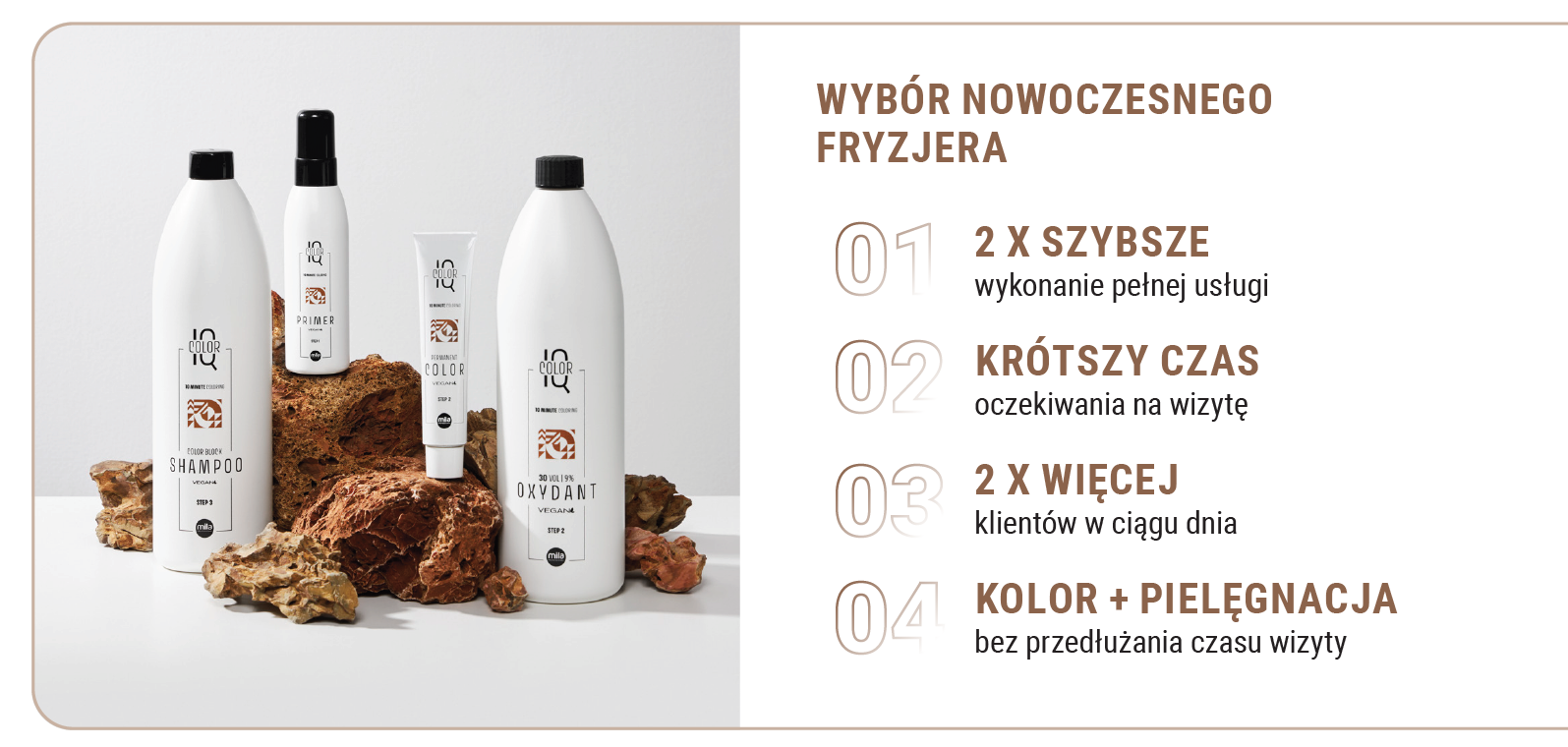 Nowoczesna koloryzacja nie musi już być kompromisem między czasem a jakością. IQ Color od Mila Professional redefiniuje zasady gry, oferując trwały, intensywny kolor, pełne krycie siwizny i możliwość rozjaśniania, a wszystko to zaledwie w 10 minut. Teraz marka poszerza paletę o 14 nowych odcieni, zaprojektowanych z myślą o temperze współczesnych, kreatywnych i świadomych fryzjerów. Nowe kolory odpowiadają na aktualne potrzeby rynku i otwierają przestrzeń do realizacji najnowszych trendów oraz personalizacji usług. Dzięki nim kobiety mogą czuć się sobą – pięknie, naturalnie i wyjątkowo.