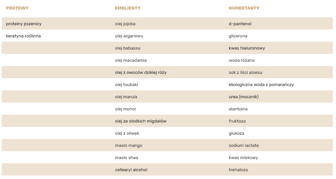 trzy składniki – proteiny, emolienty i humektanty. Istotą jest, aby odpowiednio